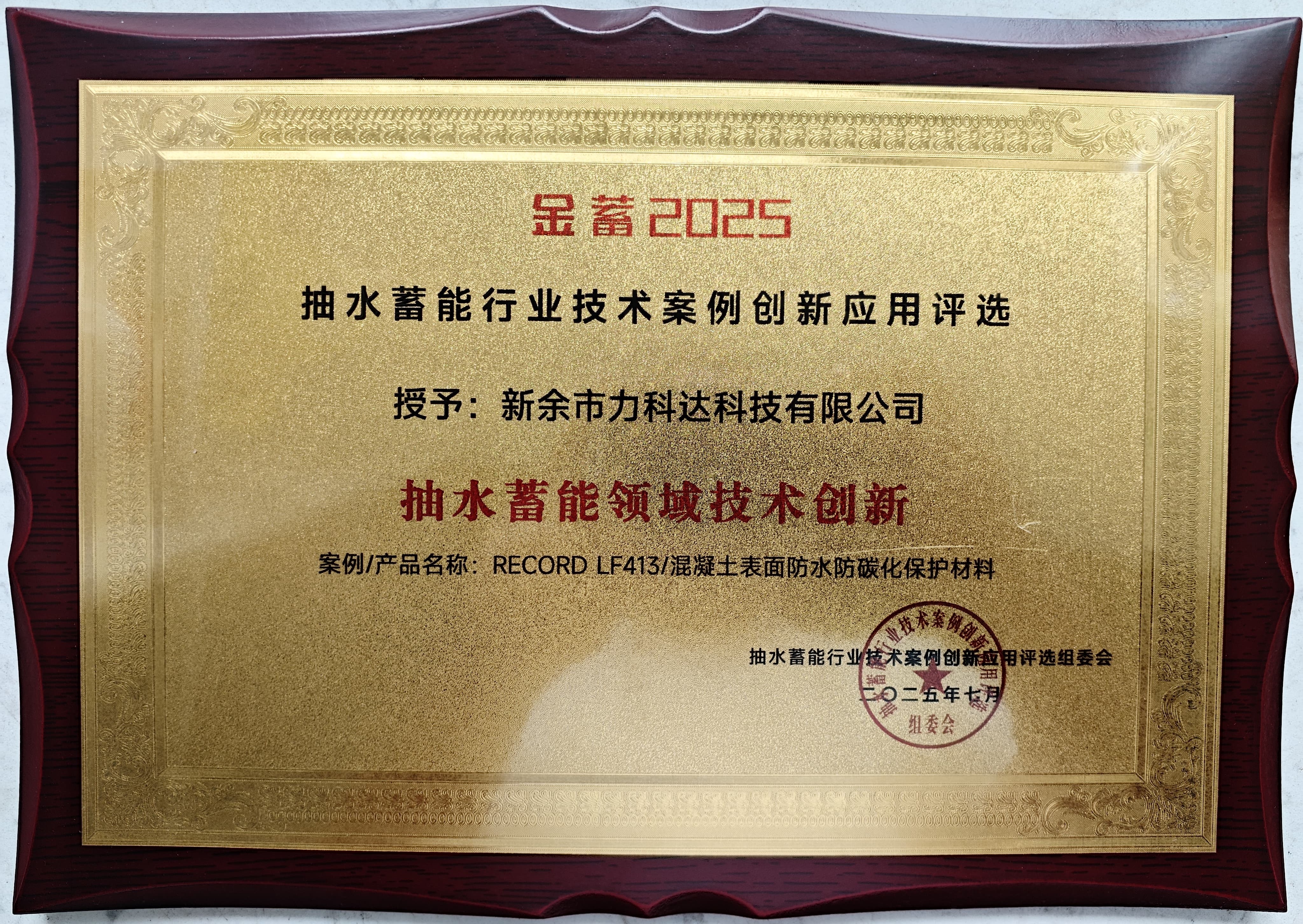 新余市力科达科技有限公司在 “金蓄奖” 2025 抽水蓄能行业技术案例创新应用评选中传来捷报,其申报的 “RECORD LF413 / 混凝土表面防水防碳化保护材料” 项目,成功斩获 “抽水蓄能领域技术创新奖”。